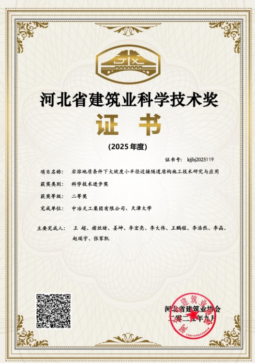 近日,由華南公司牽頭,聯(lián)合天津大學(xué)共同完成的“巖溶地質(zhì)條件下大坡度小半徑近接隧道盾構(gòu)施工技術(shù)研究與應(yīng)用”項(xiàng)目,榮獲河北省建筑業(yè)協(xié)會2025年度科學(xué)技術(shù)進(jìn)步獎(jiǎng)二等獎(jiǎng)。此項(xiàng)殊榮,標(biāo)志著華南公司在復(fù)雜地質(zhì)隧道施工技術(shù)領(lǐng)域取得了重大突破。