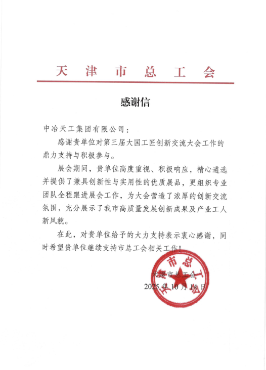 近日,工程技術(shù)總院收到天津市總工會(huì)致中冶天工感謝信。信中對(duì)中冶天工在第三屆大國(guó)工匠創(chuàng)新交流大會(huì)暨大國(guó)工匠論壇“五小”成果展示中的鼎力支持與積極參與給予充分肯定,對(duì)公司展品的“兼具創(chuàng)新性與實(shí)用性”以及專業(yè)團(tuán)隊(duì)“全程高效保障”表示高度贊賞,展現(xiàn)了天津高質(zhì)量發(fā)展創(chuàng)新成果及產(chǎn)業(yè)工人新風(fēng)貌,為大會(huì)營(yíng)造濃厚創(chuàng)新交流氛圍注入了關(guān)鍵力量。